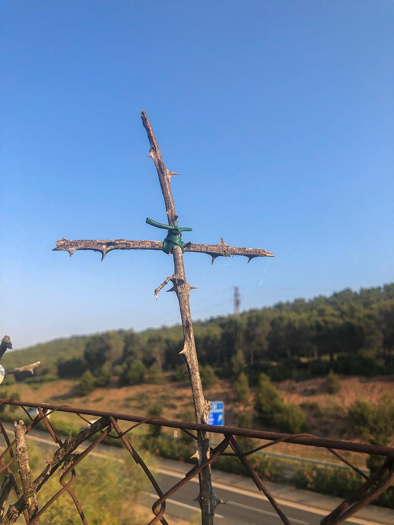 Crosses can be found all along the Camino Frances of various sizes, materials, and levels of intricacy. This simple cross high above a busy highway caught my eye. All along this iron fence are thousands of crosses made of pieces of twigs found in the area. Carefully placed by pilgrims on their way to Santiago de Compostela. I wondered about the hands that made this cross and their burdens/prayers.